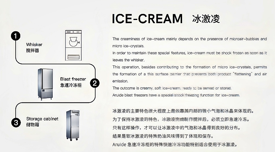 ? ? ?冰激凌的主要特色很大程度上是依靠其内部的微小气泡和冰晶来体现的。为了保持冰激凌的特色,冰激凌完成制作搅拌后,必须立即急速冷冻。只有这样操作,才可以让冰激凌中的气泡和冰晶得到良好的分布。结果是软冰激凌的特殊奶油风味得到了体现和保存。Aruide 急速冷冻柜的特殊快速冷冻功能特别适合使用于冰激凌。